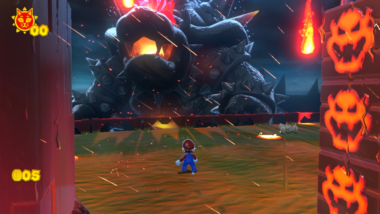 You are able to enlist Bowser Jr.’s help in 3 doses: A lot, a little, or none. With the second joycon or Pro controller, a second player can control Bowser Jr. Instead of worlds or levels, Mario (and Bowzer Jr.) are able to explore an open-world consisting of a number of islands. The islands are also well-designed with odd and unusual enemies (See the giant dodo birds in the first world) and little challenges. Kaiju Bowzer (that’s what I’m calling him) periodically appears and spits fire that rains down on Mario as the environment turns dark and the rain picks up. The battles between Mario and Kaiju Bowzer are monumental (literally– you’ll see).