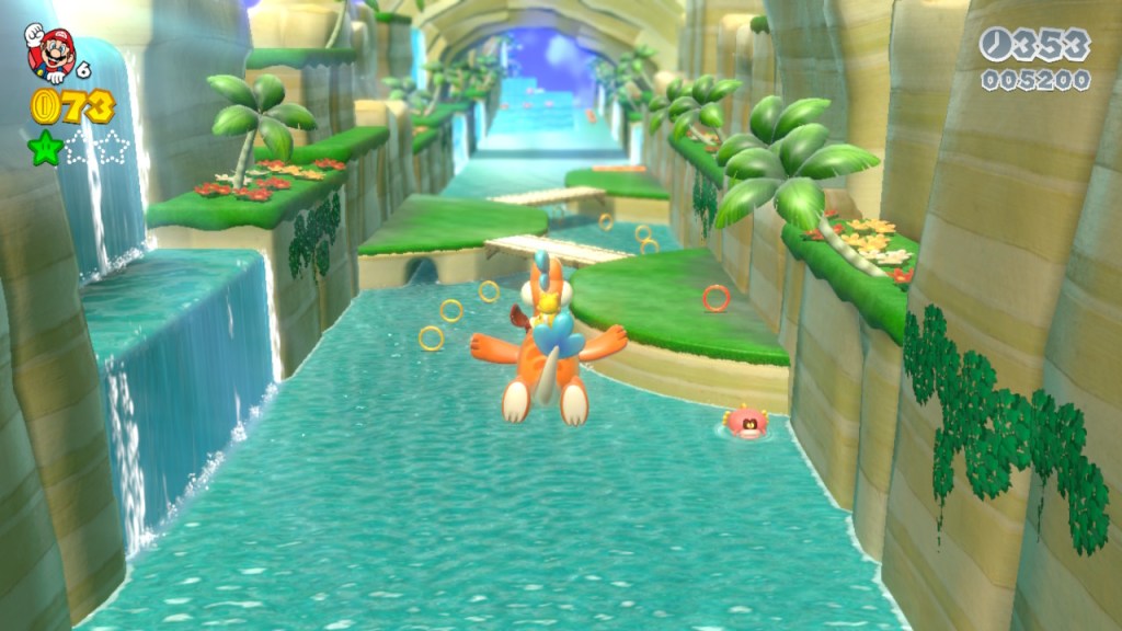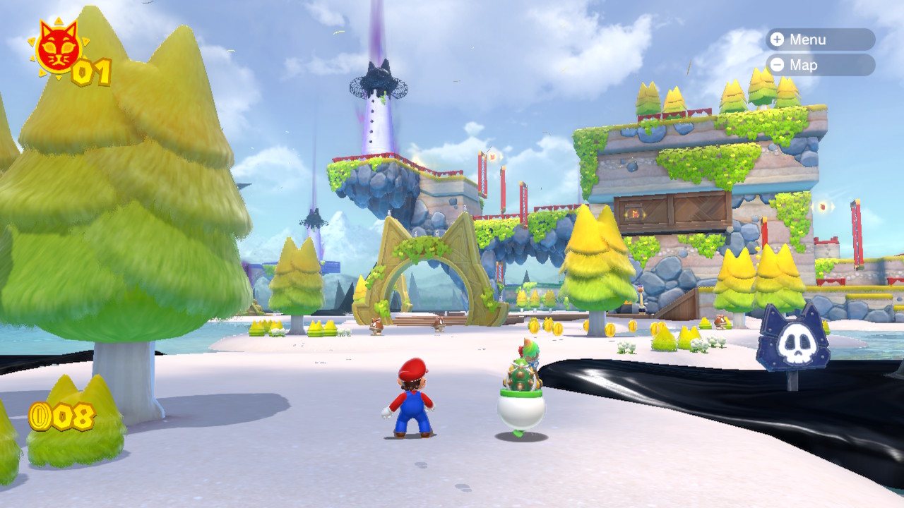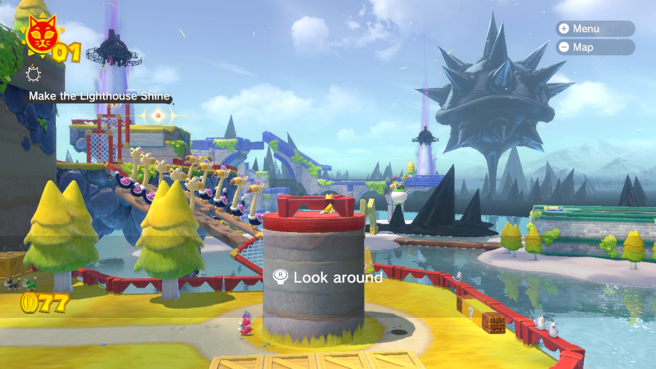 The game is, as always, a series of well-constructed levels with small puzzles, unique enemies, and one-of-a-kind power-ups. For SM3DW, as one can spot in the title, the signature power-up is the cat-suit that allows Mario to climb up walls and lunge at enemies. The game starts off strong with a number of extraordinarily-designed, colorful, themed levels.