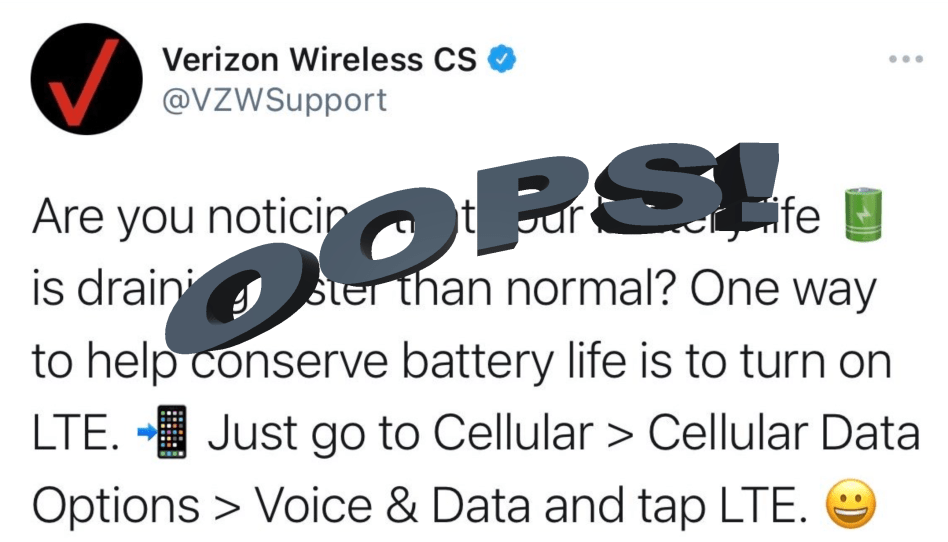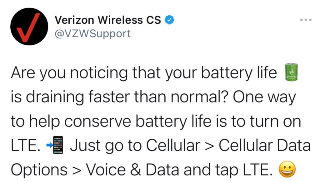 In an embarrassing moment over the weekend, the Verizon Wireless Support Customer Service Twitter account tweeted out advice that seemed ironic given Verizon’s latest media releases. In the now deleted tweet, Verizon suggested to turn on the LTE option under network settings to save on battery life. At first glance, it appears to be advice in good faith, but an “LTE” option would turn off 5G, the much-heralded new network that Verizon has trumpeted during every press release. Verizon even managed to work in an advertisement during Apple’s latest iPhone release event back in the fall of 2020. It appears that Verizon has caught wind of the offending tweet and has deleted it but we have the screenshot below.