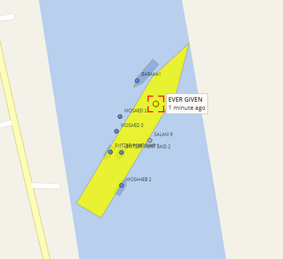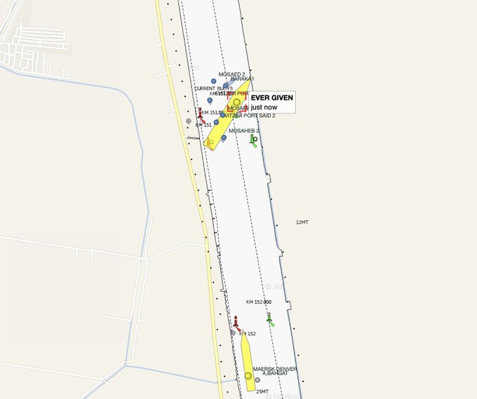 MV Ever Given, a container ship from company, Evergreen Marine, was reportedly caught up in a dust storm causing low visibility and ran aground, essentially blocking any traffic from transiting through the Suez Canal. Recent reports this morning have indicated that tug boats were able to tow the ship slightly aside but it appears the problem has not been fully resolved.